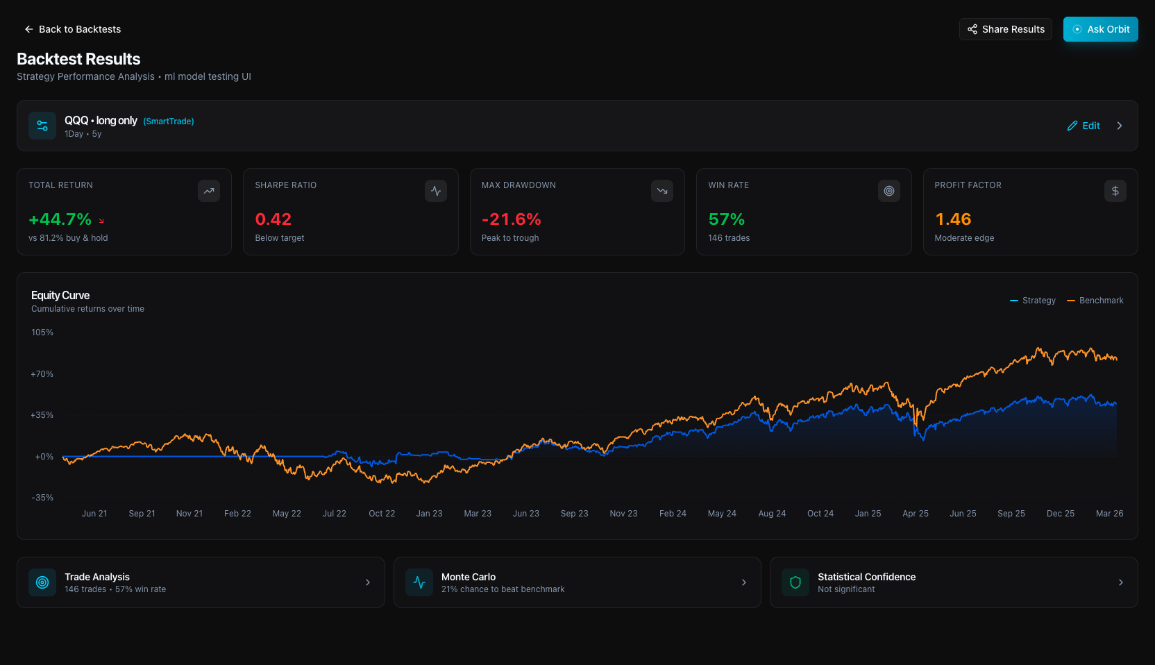 Ask Orbit to explain your backtest results. It reads the actual metrics and gives data-backed explanations.