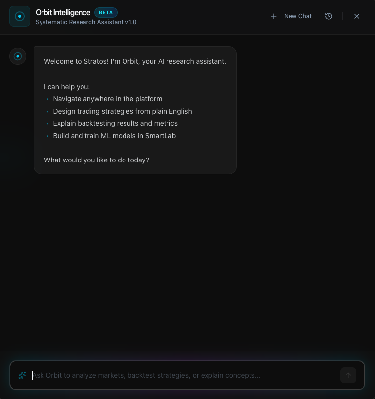 Stratos is a quantitative trading research platform that lets you design, rigorously test, and iterate on systematic trading strategies — without writing a single line of Python. Describe a strategy in plain English to Orbit, tweak it in the visual builder, and run it against years of institutional-grade market data in seconds.