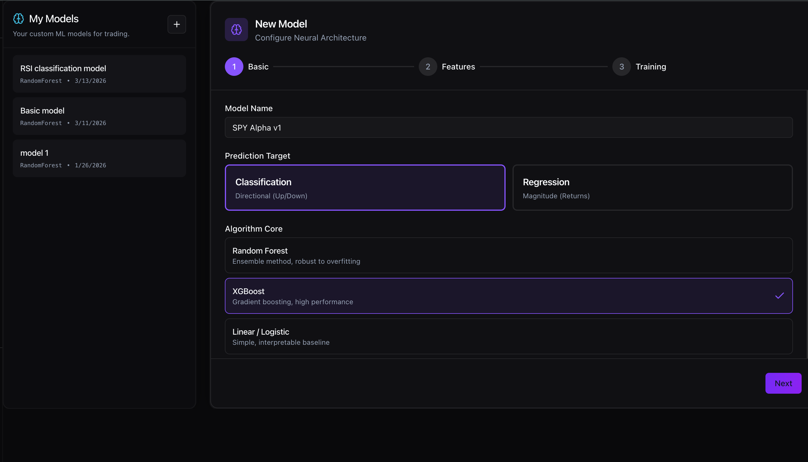 Go to SmartLab and click New Model. Give it a name, choose a prediction target (Classification for Up/Down direction, Regression for return magnitude), and select an algorithm core.