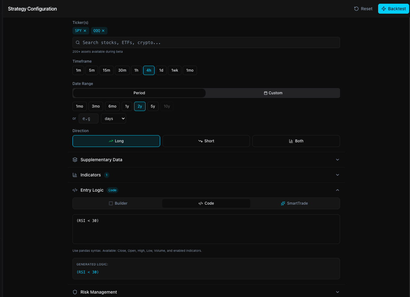 Select one or more tickers to trade. You can also add supplementary tickers (e.g., SPY, QQQ, VXX, TLT) whose data feeds into your entry logic — useful for macro-conditional strategies without trading those assets directly.